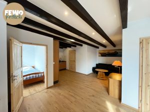 Die Ferienwohnung mit über 60 m² Wohnfläche verfügt über zwei getrennte Schlafzimmer, Schlafcouch im offenen Wohn- und Essbereich mit Küche und ein Tageslicht Bad mit Dusche. Zum Service der Ferienwohnung gehören neben bezogenen Betten auch Handtücher.